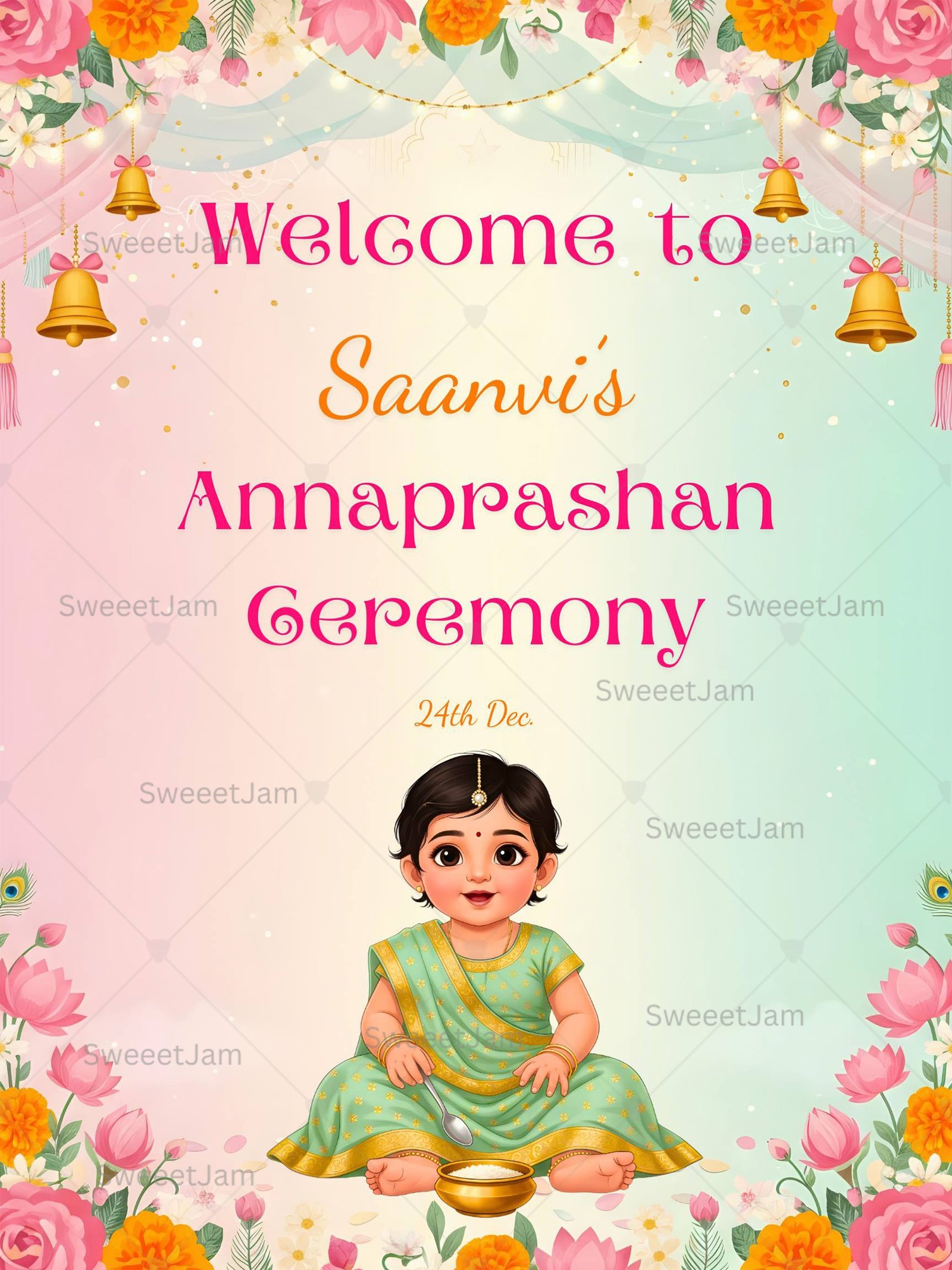 The design features a cute baby illustration seated with a rice bowl and spoon, symbolizing the sacred first feeding ritual. Soft pastel tones blend beautifully with floral borders, lotus accents, festive hanging bells, and delicate decorative elements, creating a warm and welcoming atmosphere for your event entrance.