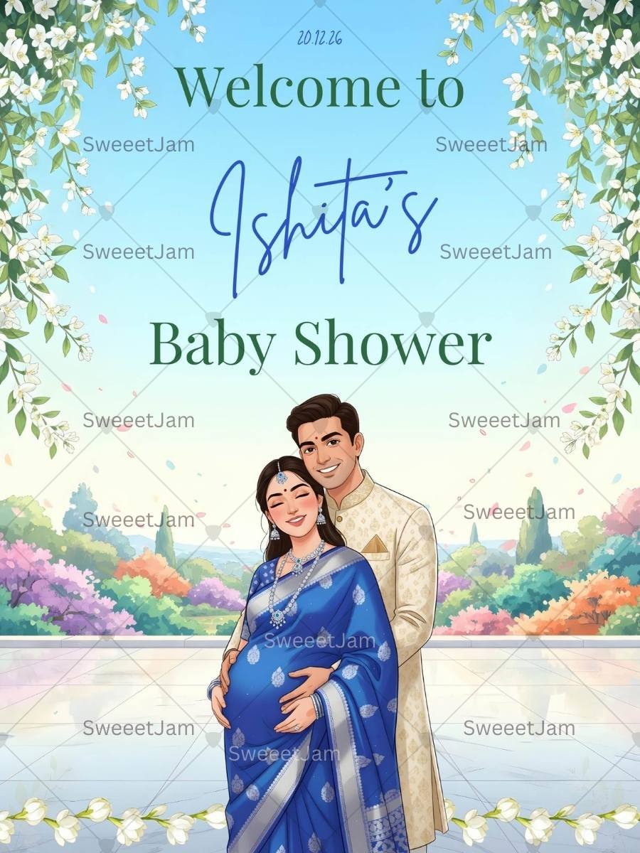 Welcome guests to your beautiful baby shower with this elegant and traditional Indian welcome sign! Featuring a lovely illustration of an expectant couple radiating blissful smiles and happiness. The mother-to-be is dressed in a gorgeous royal blue saree, perfectly complementing the tranquil garden terrace setting.