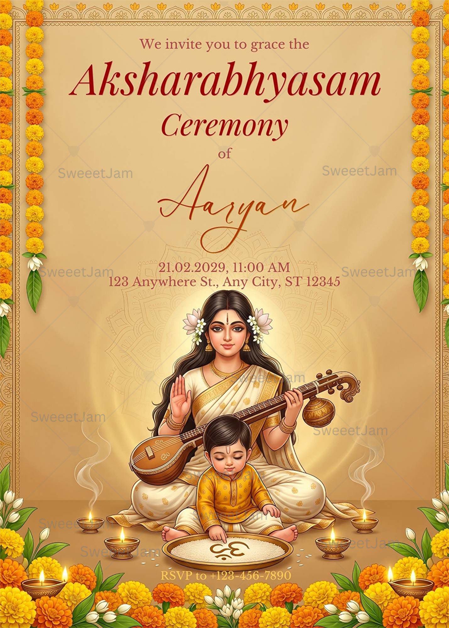 This beautifully illustrated invitation showcases a divine and traditional Indian design featuring Goddess Saraswati blessing a child during Aksharabhyasam, symbolizing wisdom, knowledge, and auspicious beginnings. The warm golden tones, marigold florals, and glowing diyas create a serene and spiritual atmosphere, perfect for this meaningful occasion.