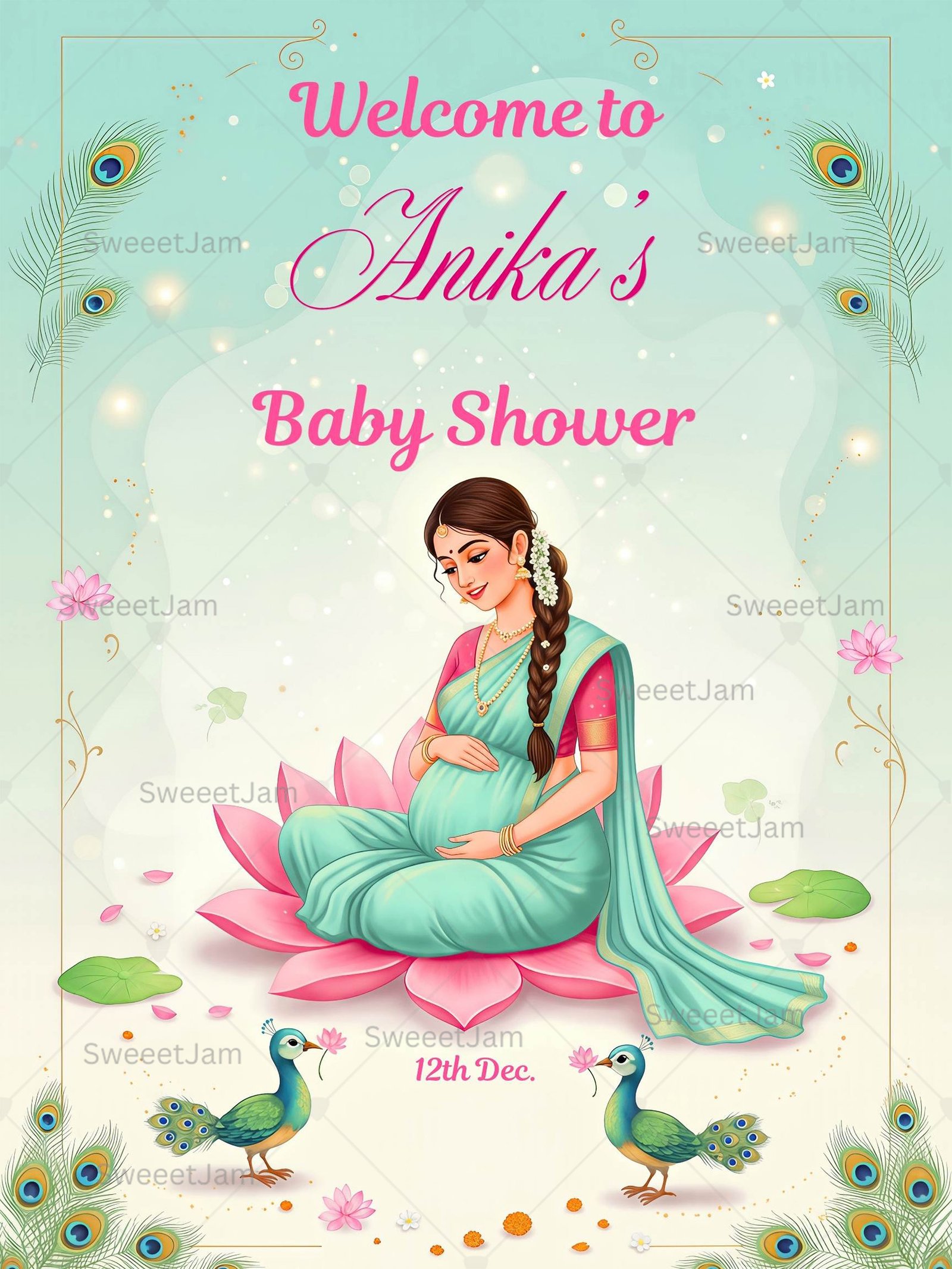 This design showcases a graceful mom-to-be seated on a blooming lotus, surrounded by soft sparkles and peacock feather accents—symbolizing blessings, prosperity, and new beginnings. The pastel color palette and traditional Indian illustration style make this welcome sign perfect for baby showers, Seemantham, or traditional maternity celebrations.