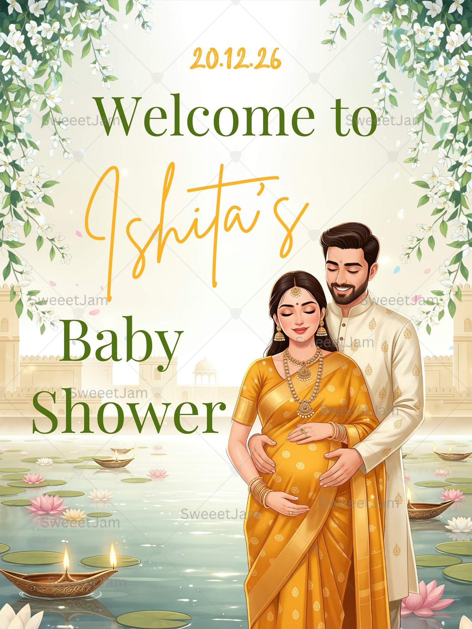 This design features a graceful expecting couple dressed in traditional Indian attire, standing beside a tranquil water setting with floating diyas and lotus flowers. The soft green and golden tones symbolize peace, prosperity, and new beginnings, while the floral frame adds a gentle festive charm—making this welcome board a perfect décor piece for a baby shower celebration.