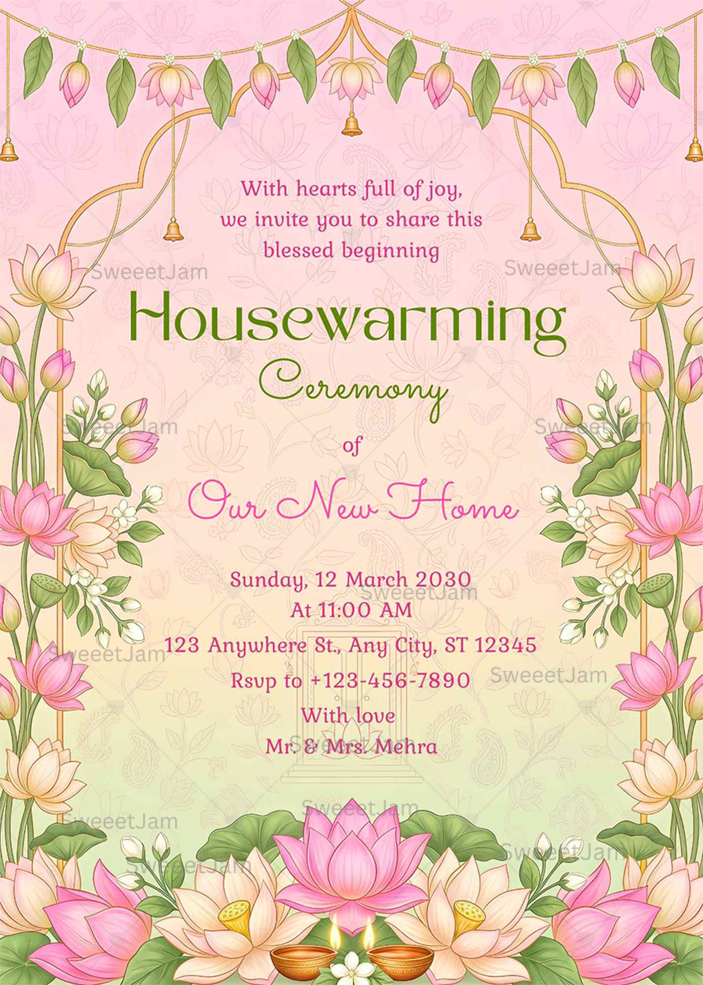 Designed with soft pastel tones, lotus florals, hanging bells, and traditional Indian motifs, this invitation reflects peace, prosperity, and new beginnings.