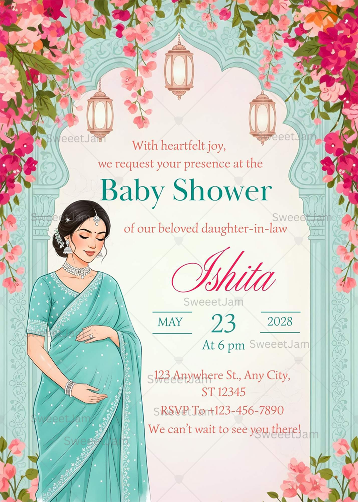 This design features a serene floral arch with hanging lanterns and a soft pastel color palette, paired with an elegant illustration of an expectant mother dressed in traditional Indian attire. The gentle florals and calming tones create a warm, graceful, and celebratory atmosphere, making this invitation a meaningful keepsake for this special occasion.