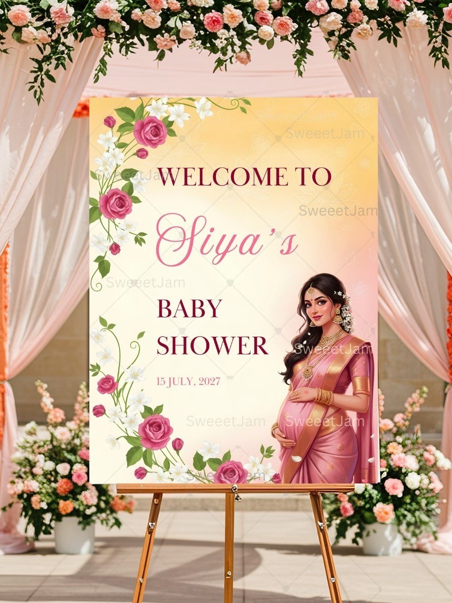 Beautiful Indian baby shower welcome sign template with elegant Indian design. Instant download, easy to customize. Print or display digitally. Perfect for godh bharai, baby shower ceremonies.