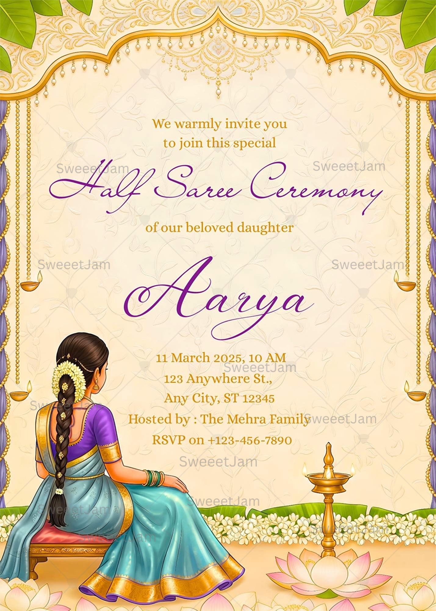 With warmth and tradition, invite family and friends to celebrate the Half Saree Ceremony of your beloved daughter Aarya using this beautifully designed digital invitation.