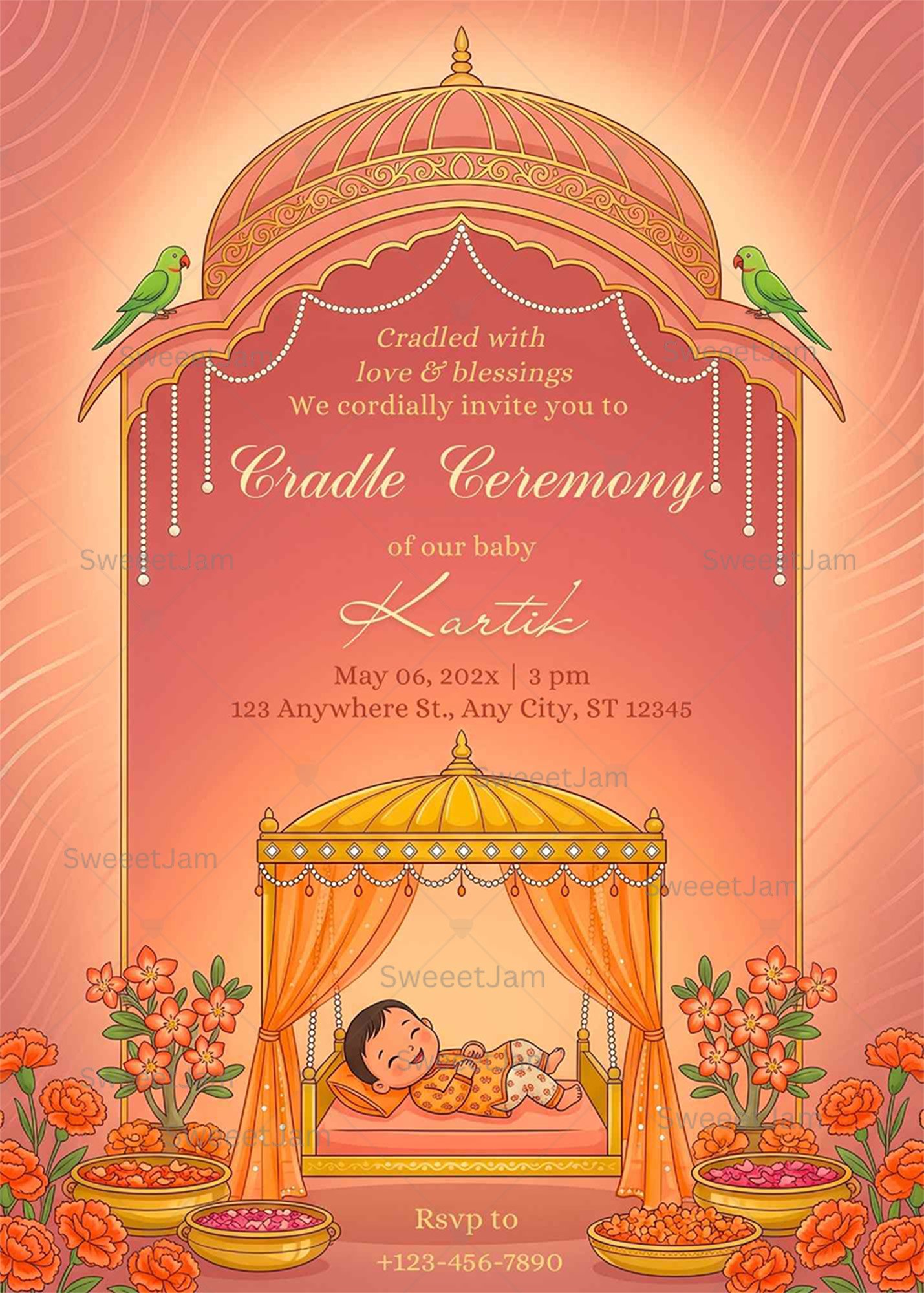 Celebrate your baby’s Cradle Ceremony with this beautifully designed traditional Indian invitation. Featuring a royal canopy cradle, warm peach and gold tones, floral bowls, parrots, and classic Indian motifs, this design reflects love, blessings, and cultural elegance.
