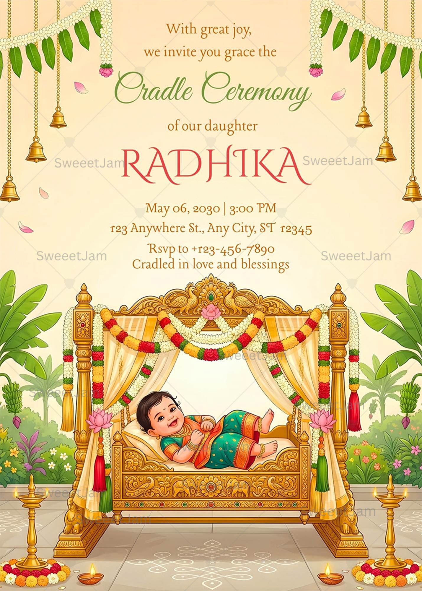This design features a richly decorated traditional cradle adorned with floral garlands, bells, lamps, and lush greenery, symbolizing love, blessings, and new beginnings. The soft pastel background and classic Indian elements make it perfect for welcoming family and friends to share in this sacred occasion.