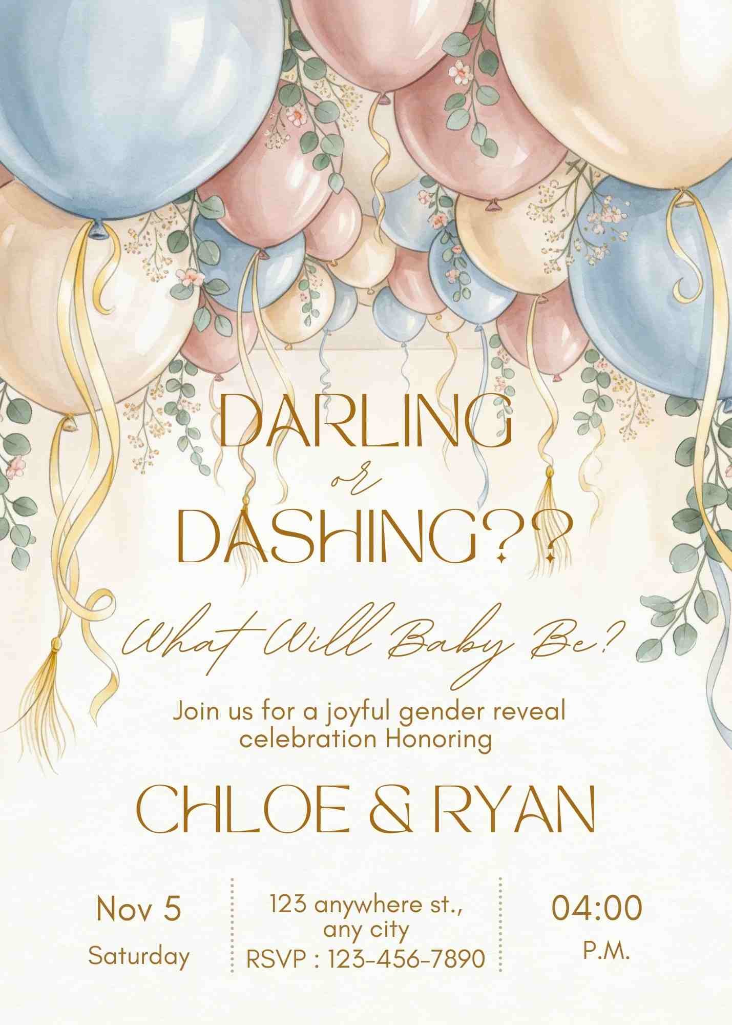 Editable Gender Reveal Invitation Darling or Dashing, Blue Pink Balloon Gender Reveal, What Will Baby Be, boy or girl, he or she Template.