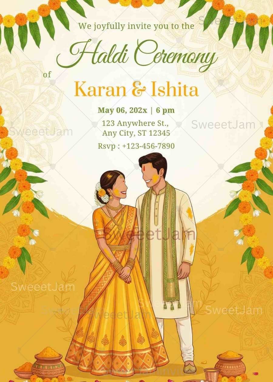 Celebrate the most golden day before forever with this stunning illustrated Haldi ceremony invitation — a beautifully drawn couple in traditional Haldi attire, marigold garlands framing the top, turmeric bowls at the base, and a warm golden background that perfectly captures the joy and energy of a Haldi ceremony.