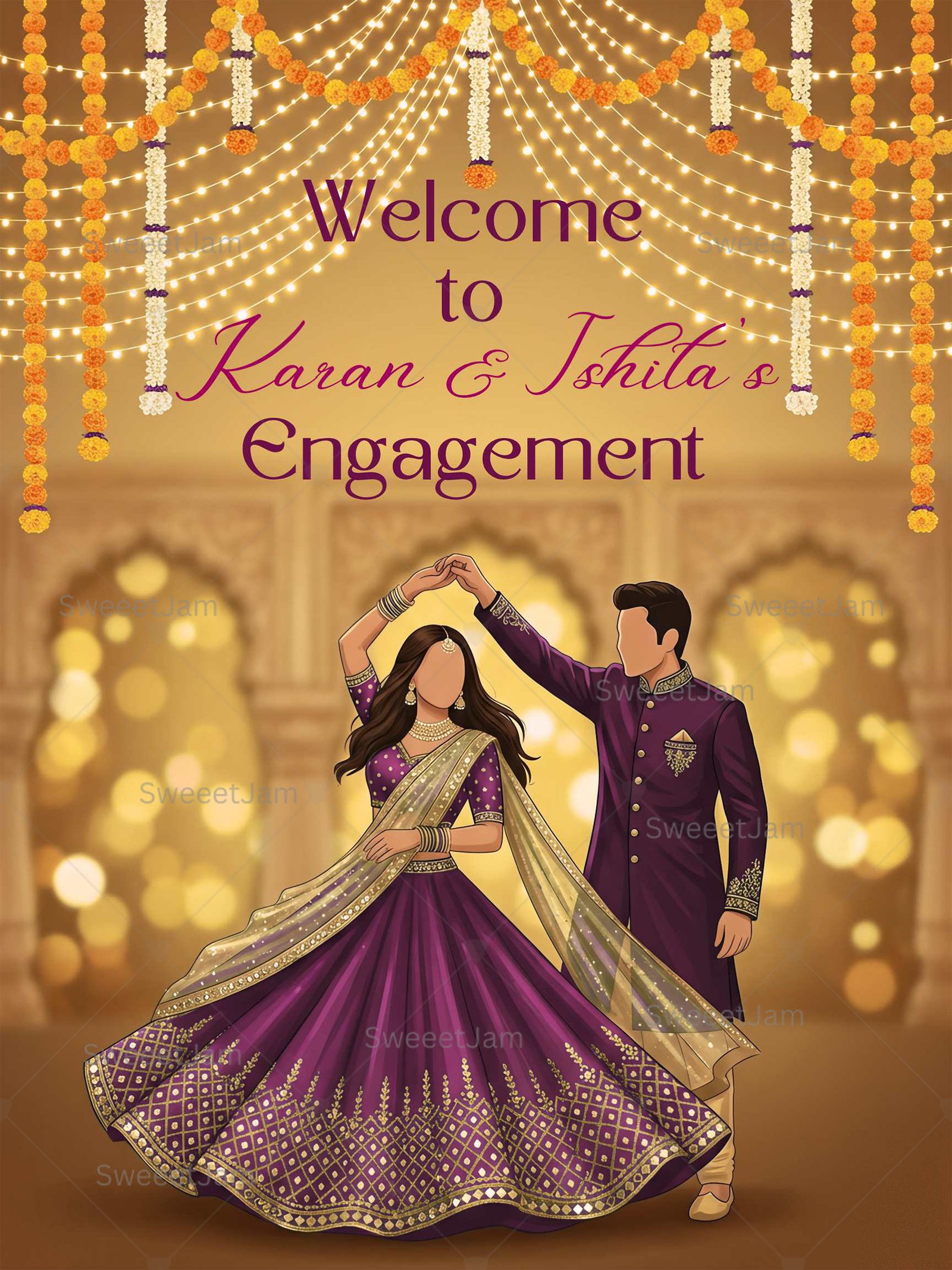 Designed with warm golden tones, glowing fairy lights, traditional marigold garlands, and a graceful dancing couple illustration, this welcome board perfectly captures the joy and elegance of an Indian engagement celebration.