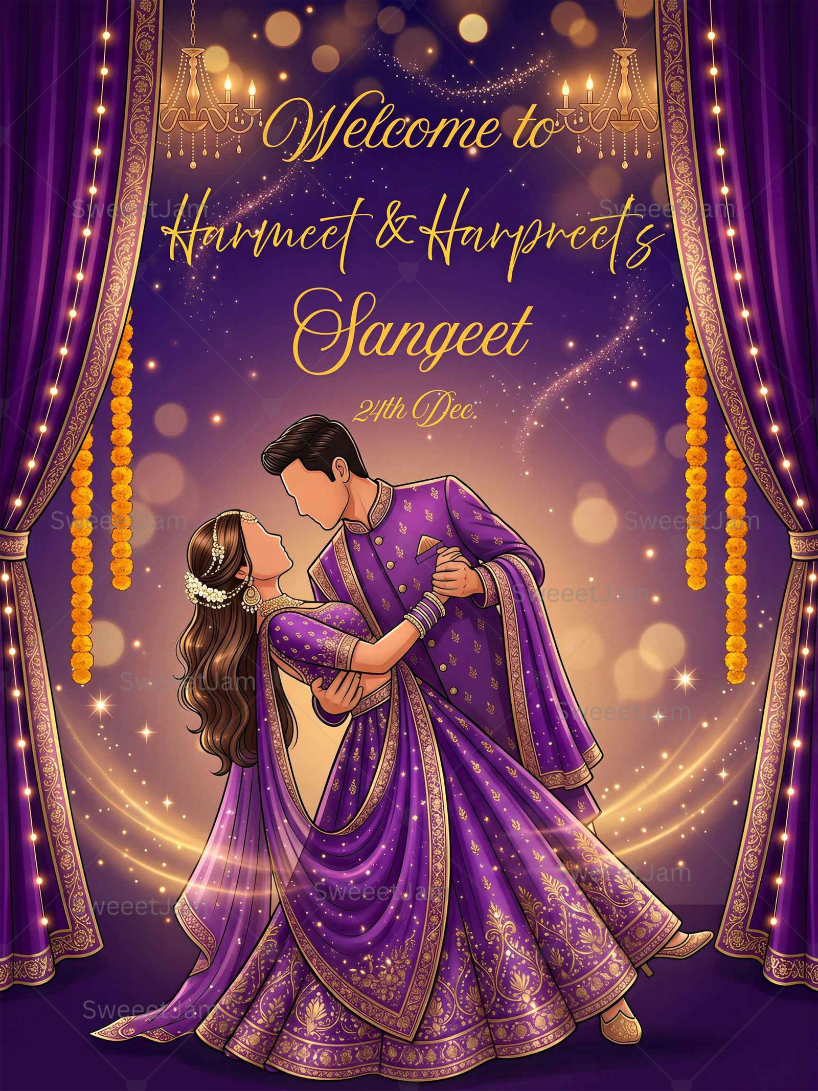 Designed with rich purple tones, glowing chandeliers, sparkling lights, and a graceful dancing couple illustration, this welcome board perfectly captures the joy, rhythm, and romance of a Sangeet night.
