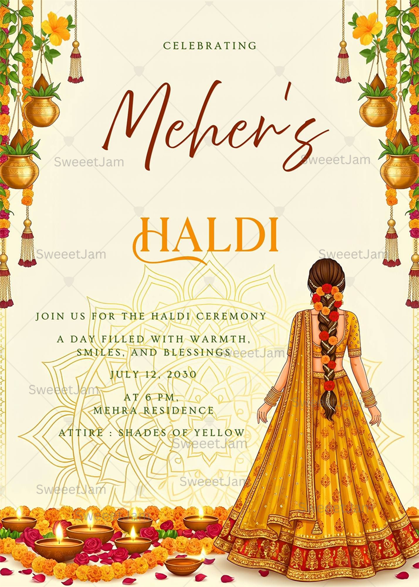 Celebrate the warmth, happiness, and traditions of an Indian wedding with this beautifully illustrated Haldi Ceremony Invitation. Designed with rich yellow tones, traditional decor, floral accents, and a graceful bridal illustration, this invitation perfectly captures the spirit of the Haldi ritual.