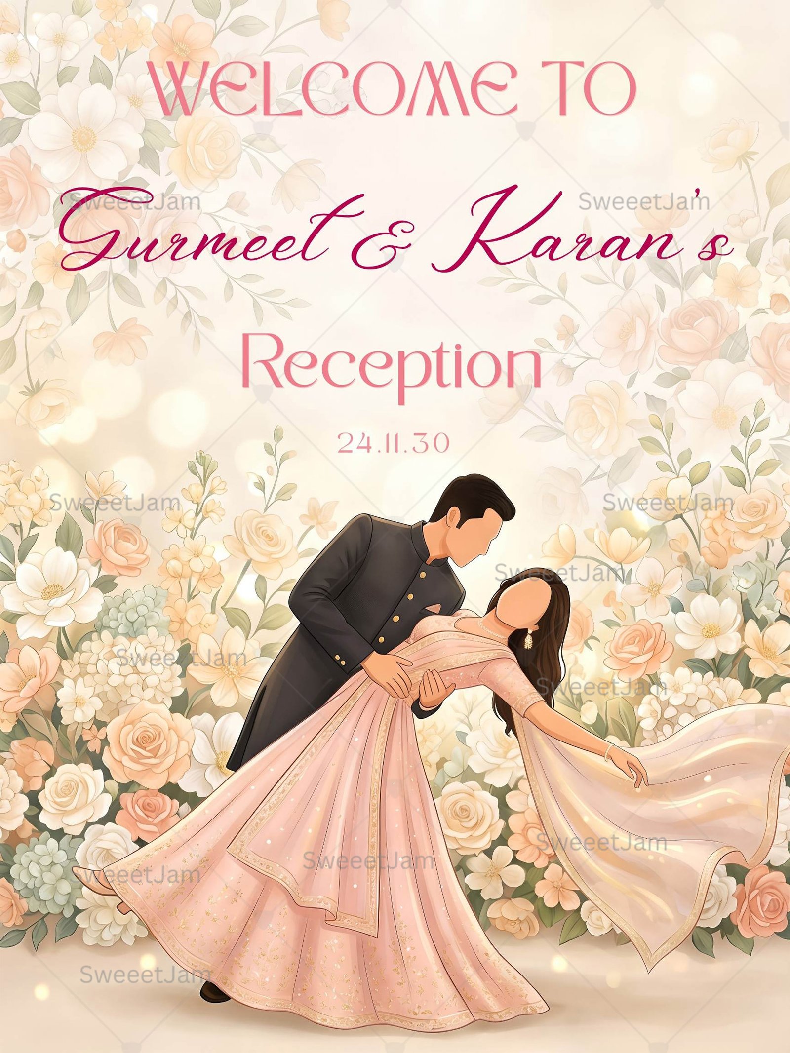 Designed with soft pastel florals and a graceful couple illustration, this welcome board adds a timeless and elegant touch to your wedding celebration.
